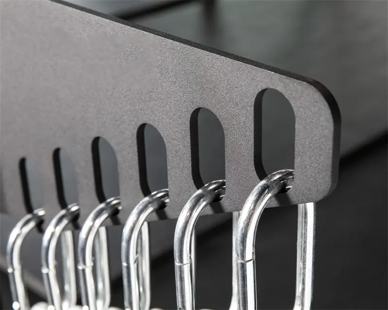 An installed Chain Hanger will extend 17.5” from the mounting surface, making it ideal for setting up in the back 24” depth space of our racks and rigs. The mounting holes are spaced 6” on center, and (2) black zinc bolt assemblies are included standard. Each side of the Chain Hanger also includes ¼” thick plastic to help protect both the attached carabiner and the hanger itself from damage.